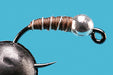 - Tied with a slotted tungsten bead on a 45 degree jig hook.